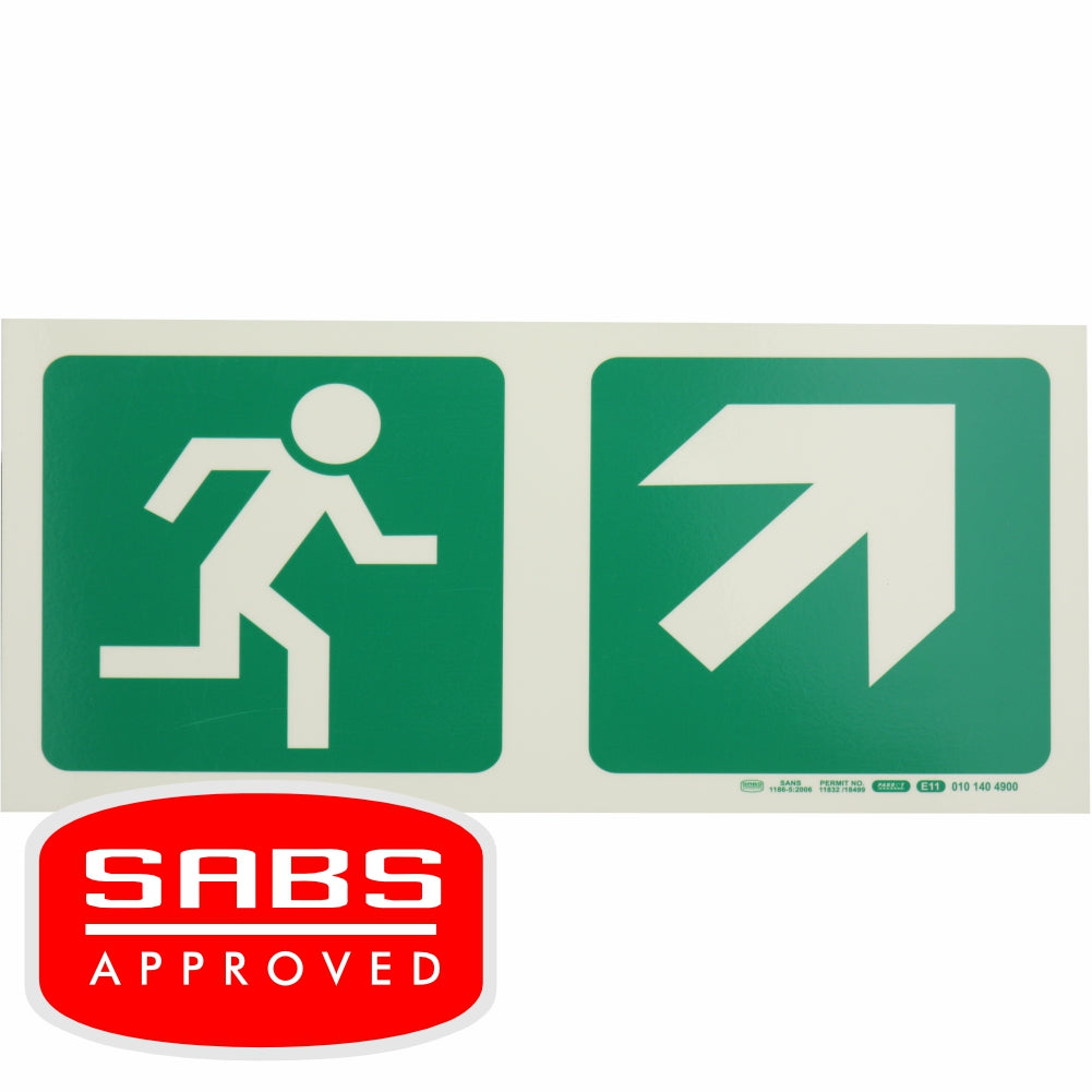 Photoluminescent 190MM Safety Sign - E11-Running Man+Diagonal Arrow Up And Right