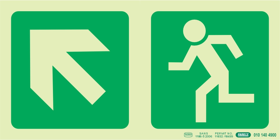 Photoluminescent 190MM Safety Sign - E12-Diagonal Arrow Up AND Left+Running Man