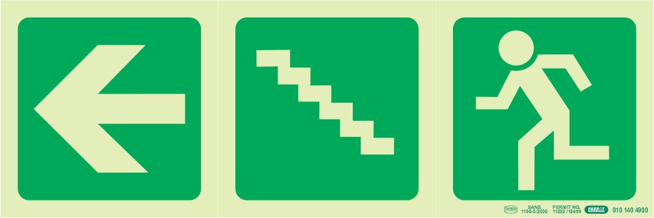 Photoluminescent 190MM Safety Sign - E19-Arrow Left+Stairs Going Up+Running Man